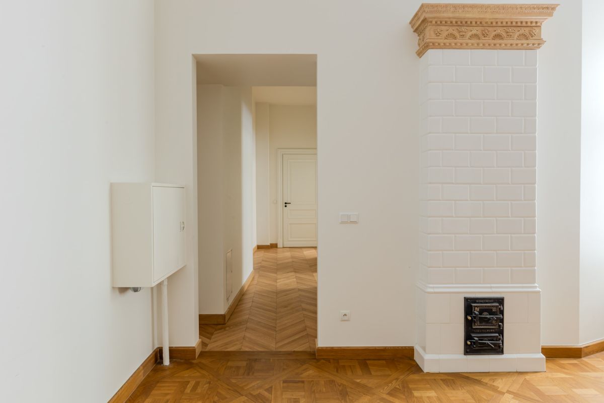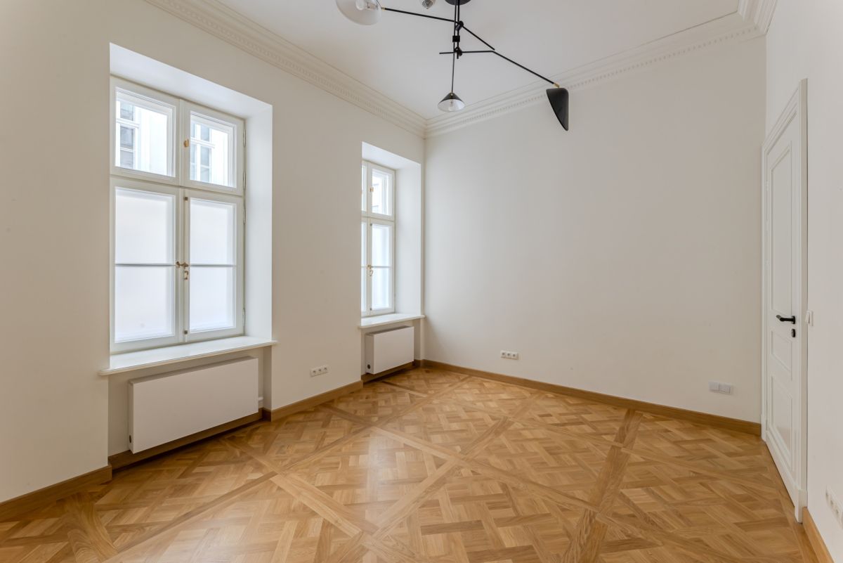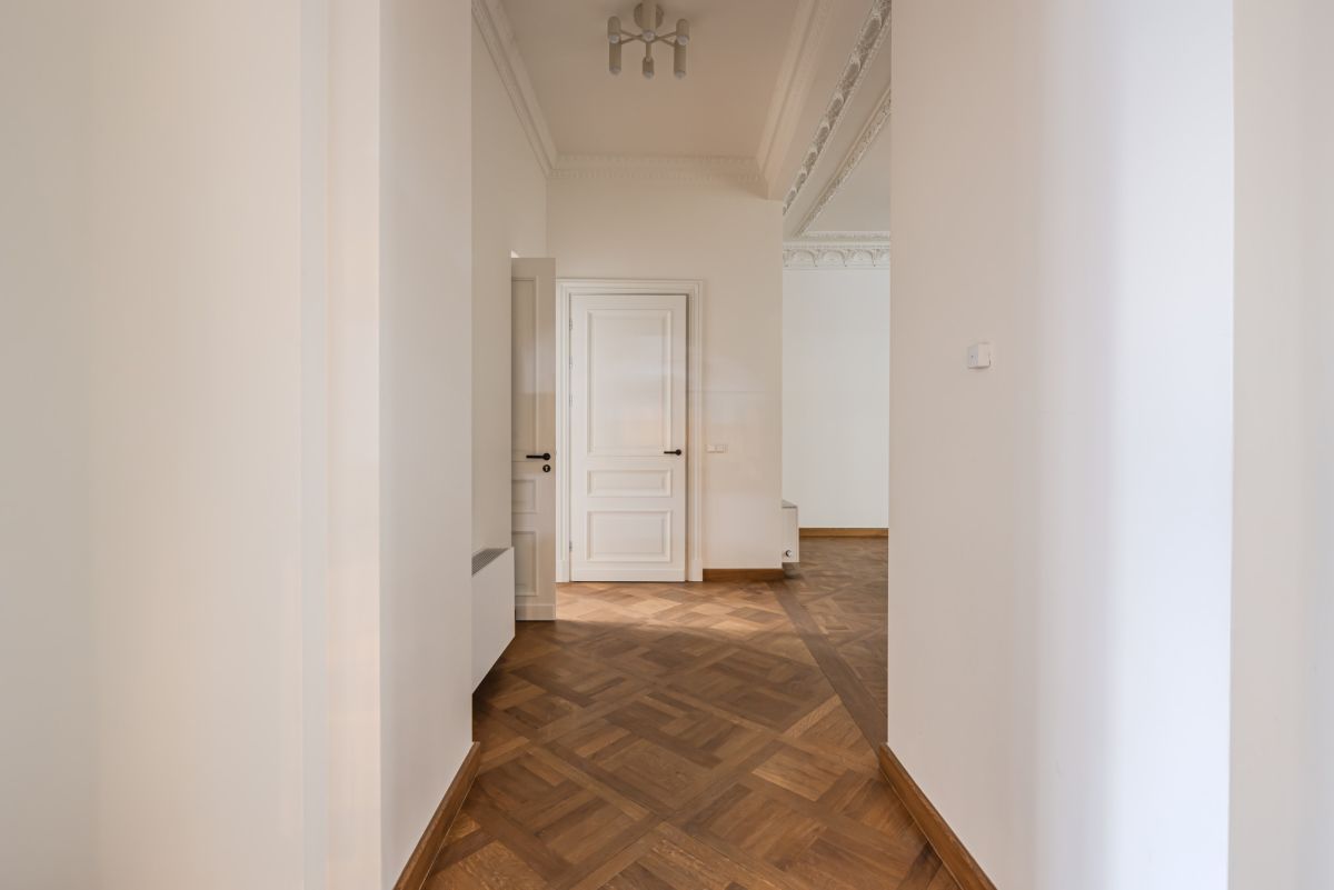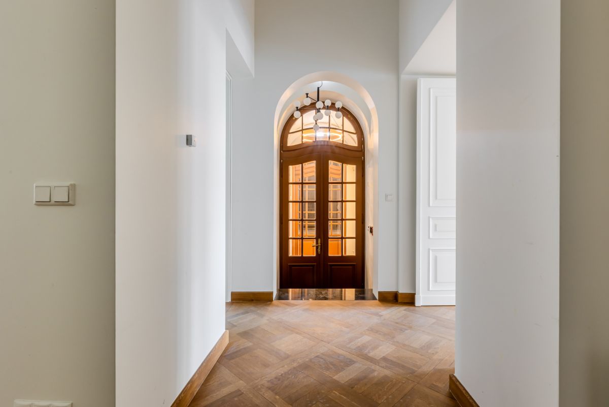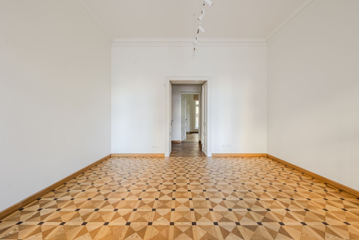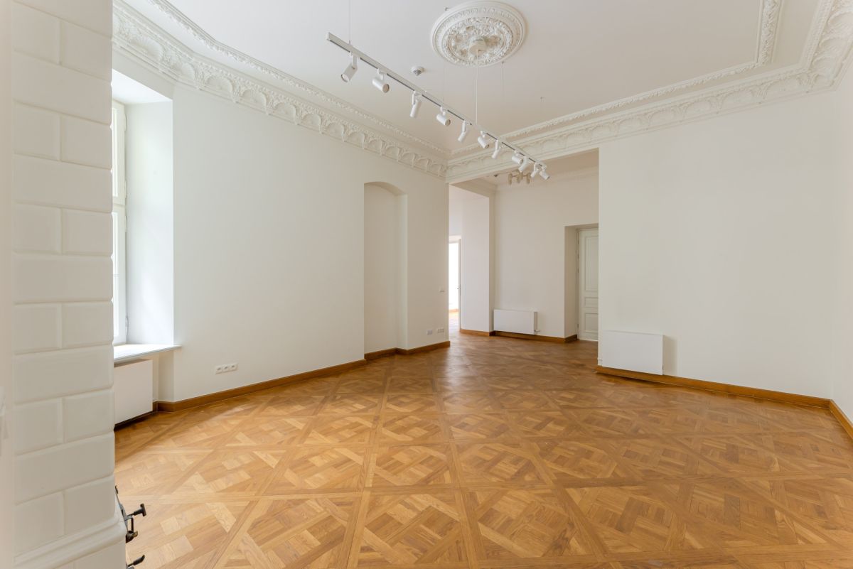 Первая часть включает просторные и элегантные помещения с сохранёнными оригинальными историческими элементами — лепниной и паркетом, уложенным в четырёх различных узорах, характерных для архитектуры рубежа XIX и XX веков. Особый акцент создают две старинные кафельные печи — бережно отреставрированные и перенесённые из апартаментов.
