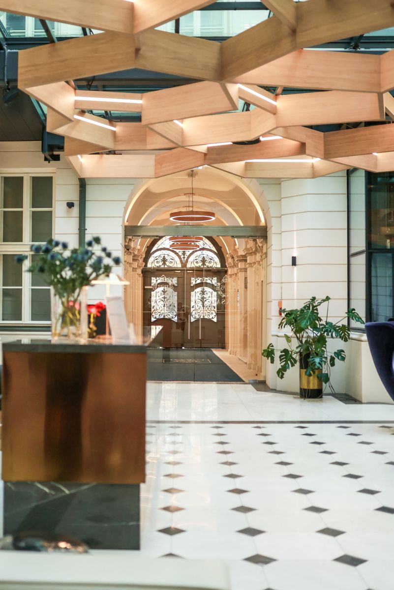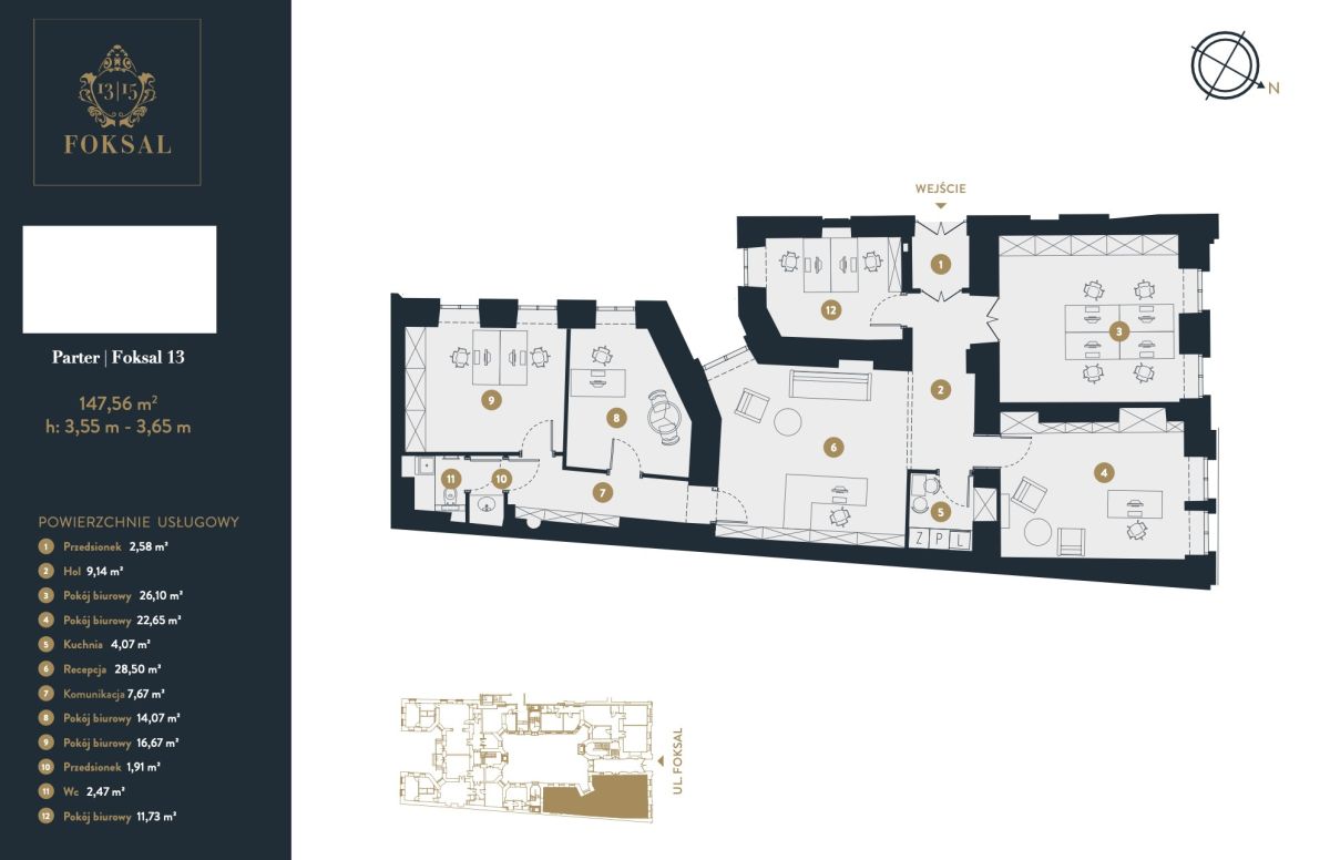 Впечатляющий входной холл ведёт к трём офисным кабинетам площадью от 12 м² до 26 м² (два из них с окнами на улицу Foksal), кухне и центральной точке помещения — рецепции площадью 29 м². Это самое большое пространство выделяется изысканной резной потолочной лепниной, кафельной печью и паркетом из нескольких пород дерева, что придаёт ему утончённый, почти дворцовый характер.