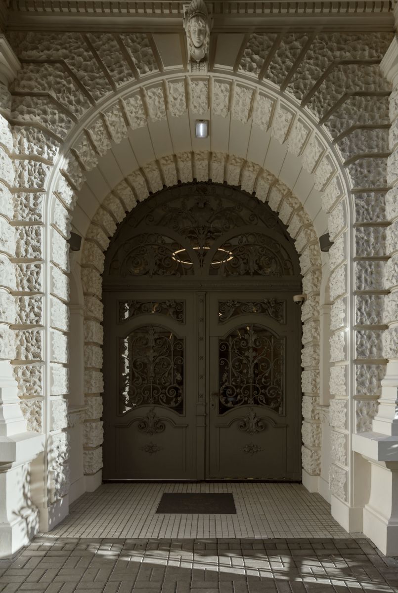 В помещение ведёт отреставрированная парадная арка особняка, украшенная массивными скульптурами атлантов, поддерживающих расположенный выше балкон. Вход находится во фронтальном вестибюле с лестничными ступенями и элегантными остеклёнными двустворчатыми дверями высотой 3 метра.
