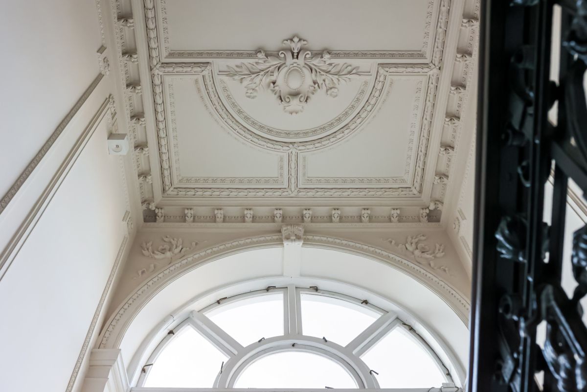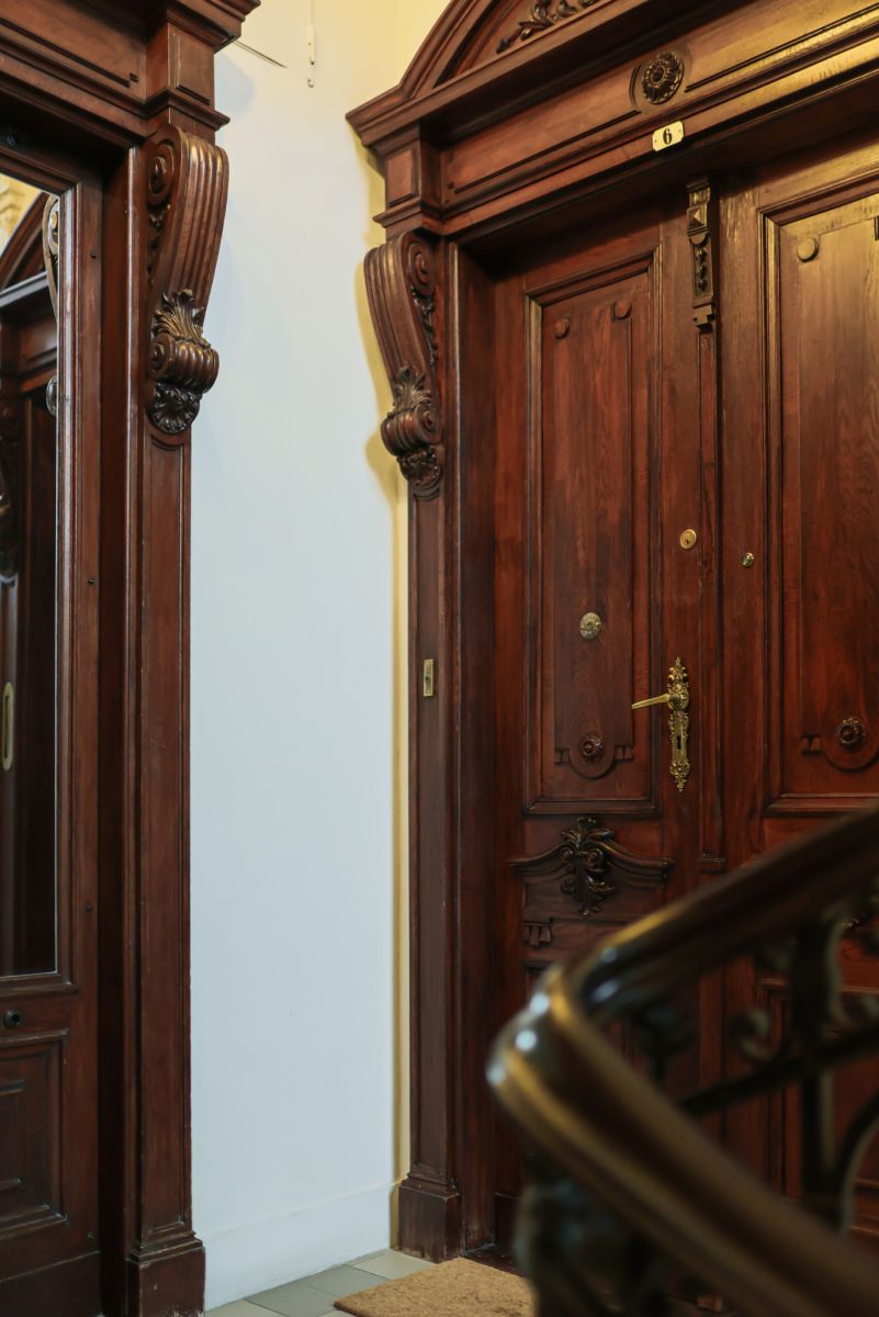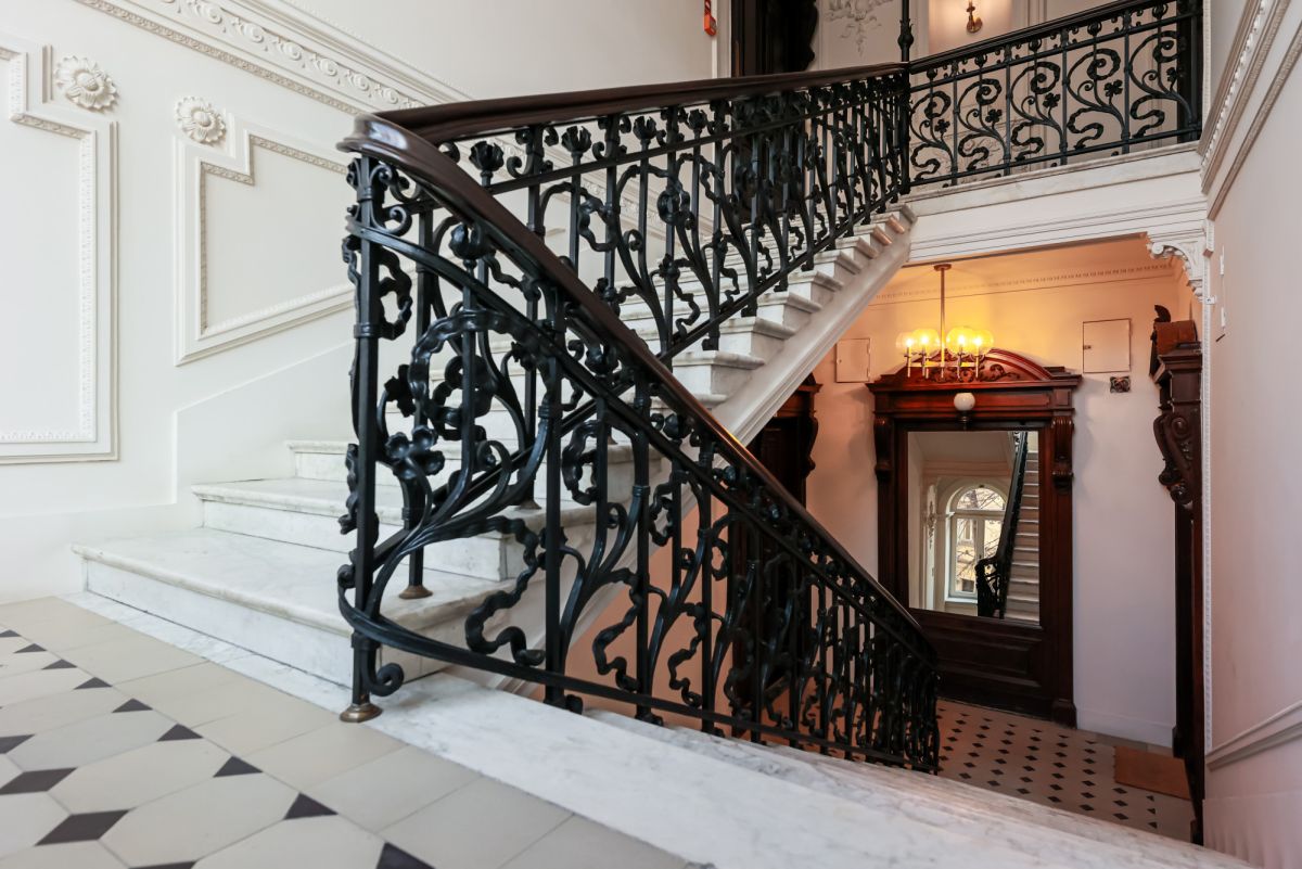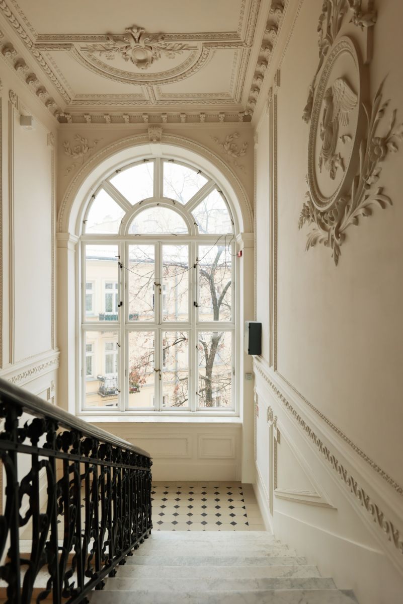 The eclectic building has undergone a full renovation and impresses with its elegant staircases and preserved original architectural details.