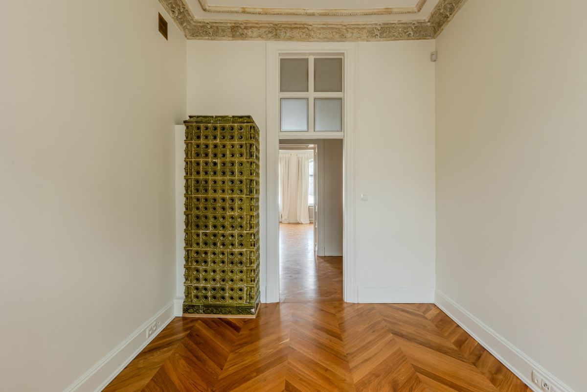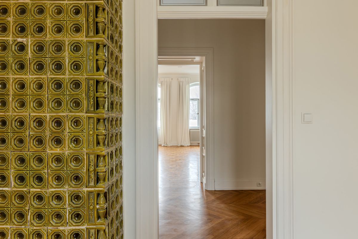 The interior retains outstanding original features, including traditional tiled stoves in every room, original wooden floors and classic double doors, creating a timeless pre-war atmosphere.