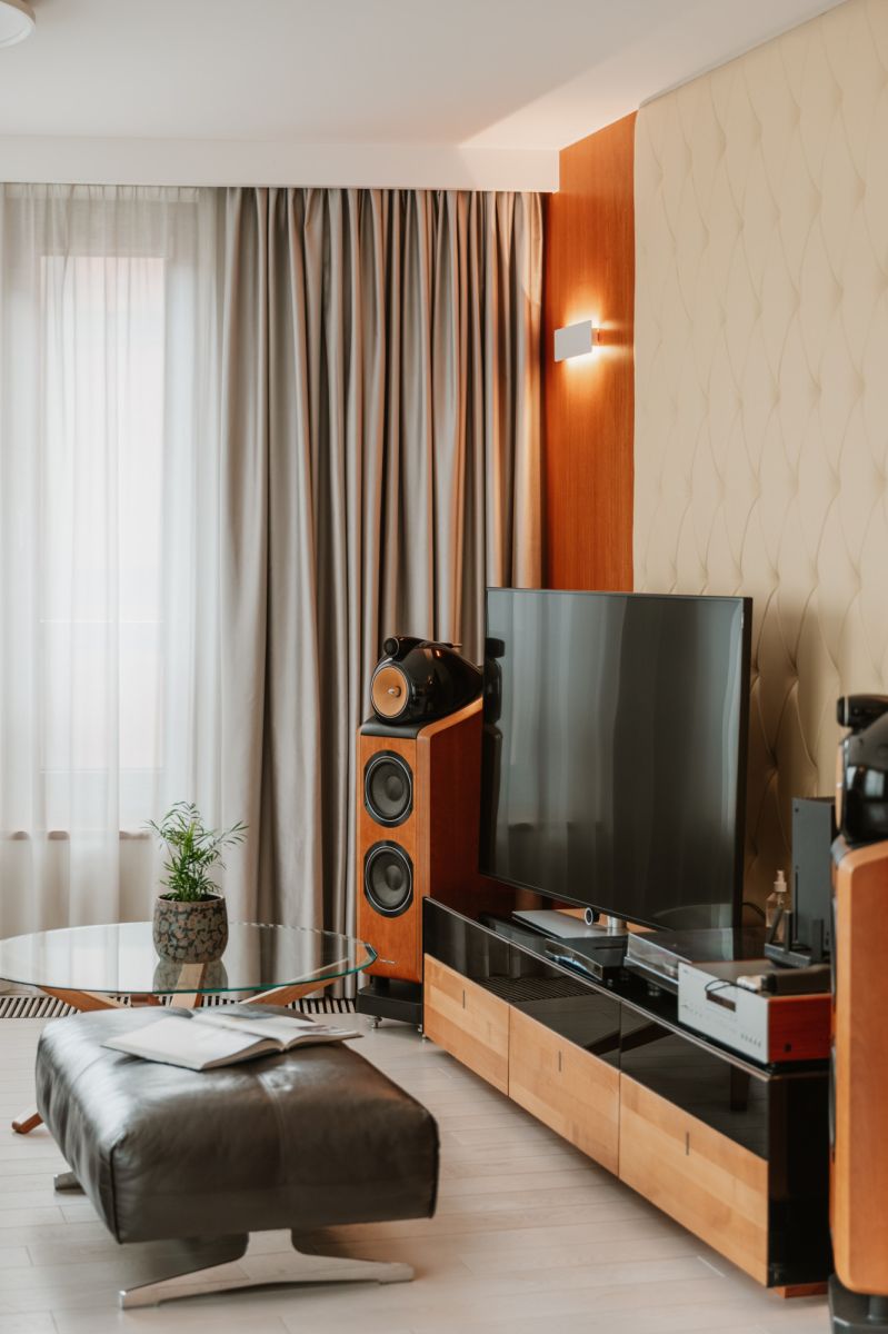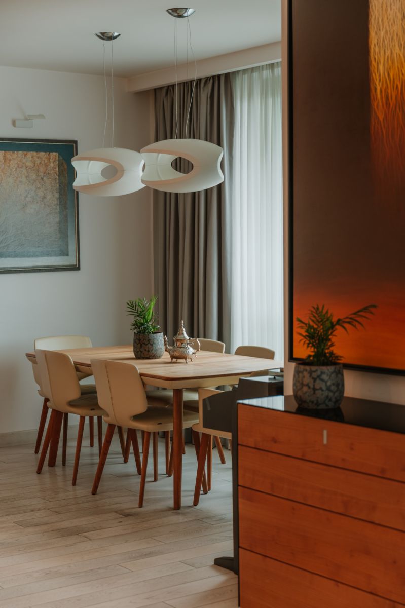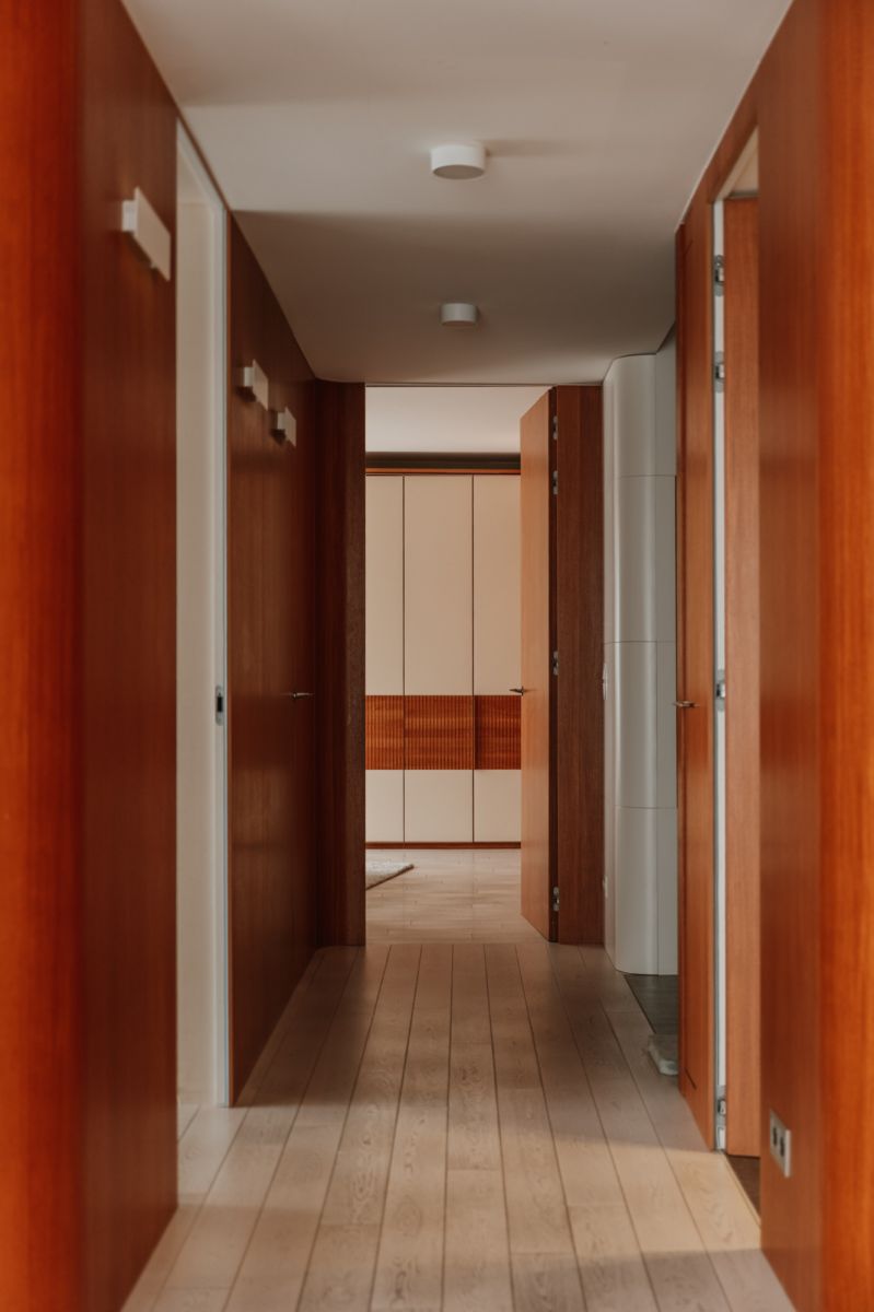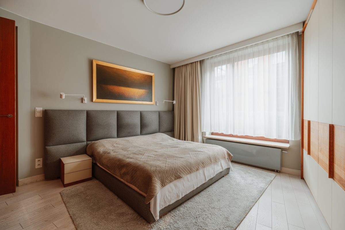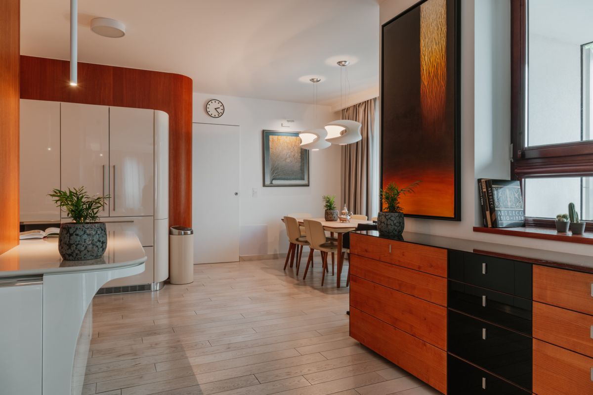 Przestronny salon z panoramicznymi oknami i wyjściem na loggię, otwarta kuchnia z jadalnią, pokój kinowy z dodatkową loggią, sypialnia master z prywatną łazienką (wolnostojąca wanna, bidet), dodatkowa sypialnia, gabinet, druga łazienka z prysznicem oraz osobna pralnia. W holu oraz w sypialniach - liczne zabudowy stolarskie.