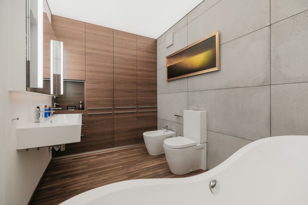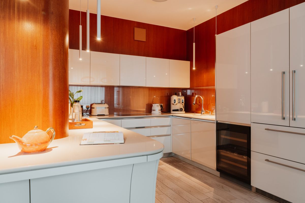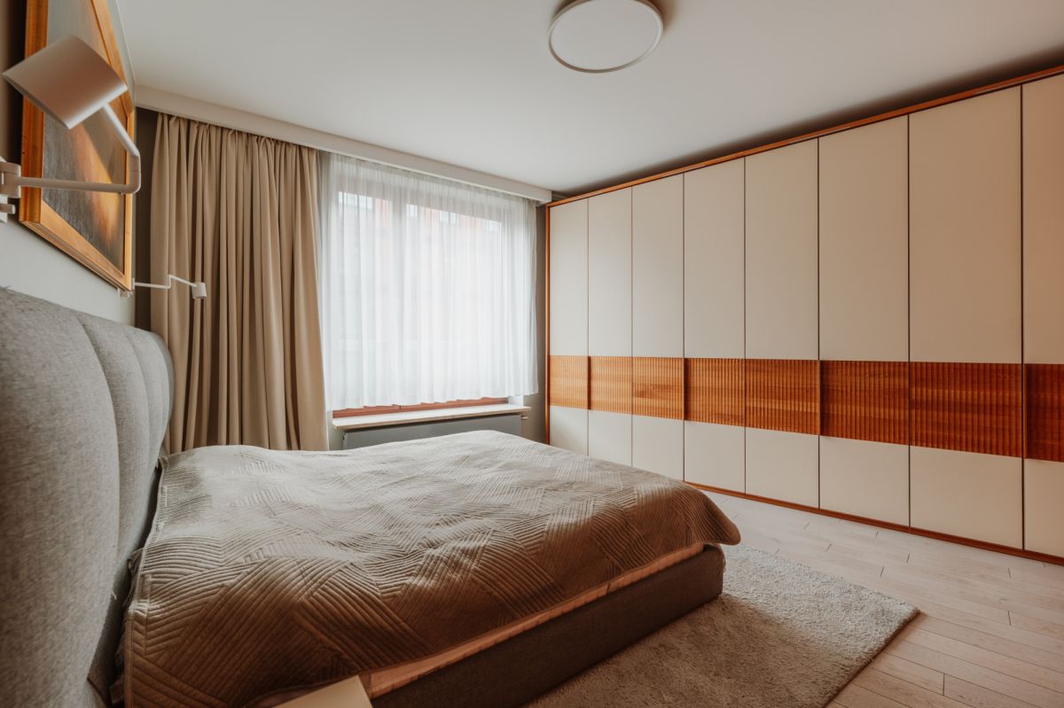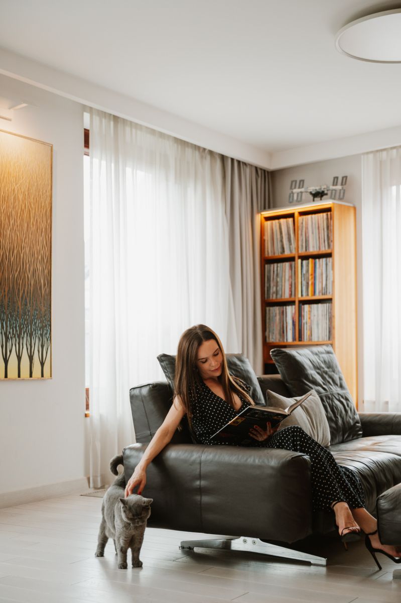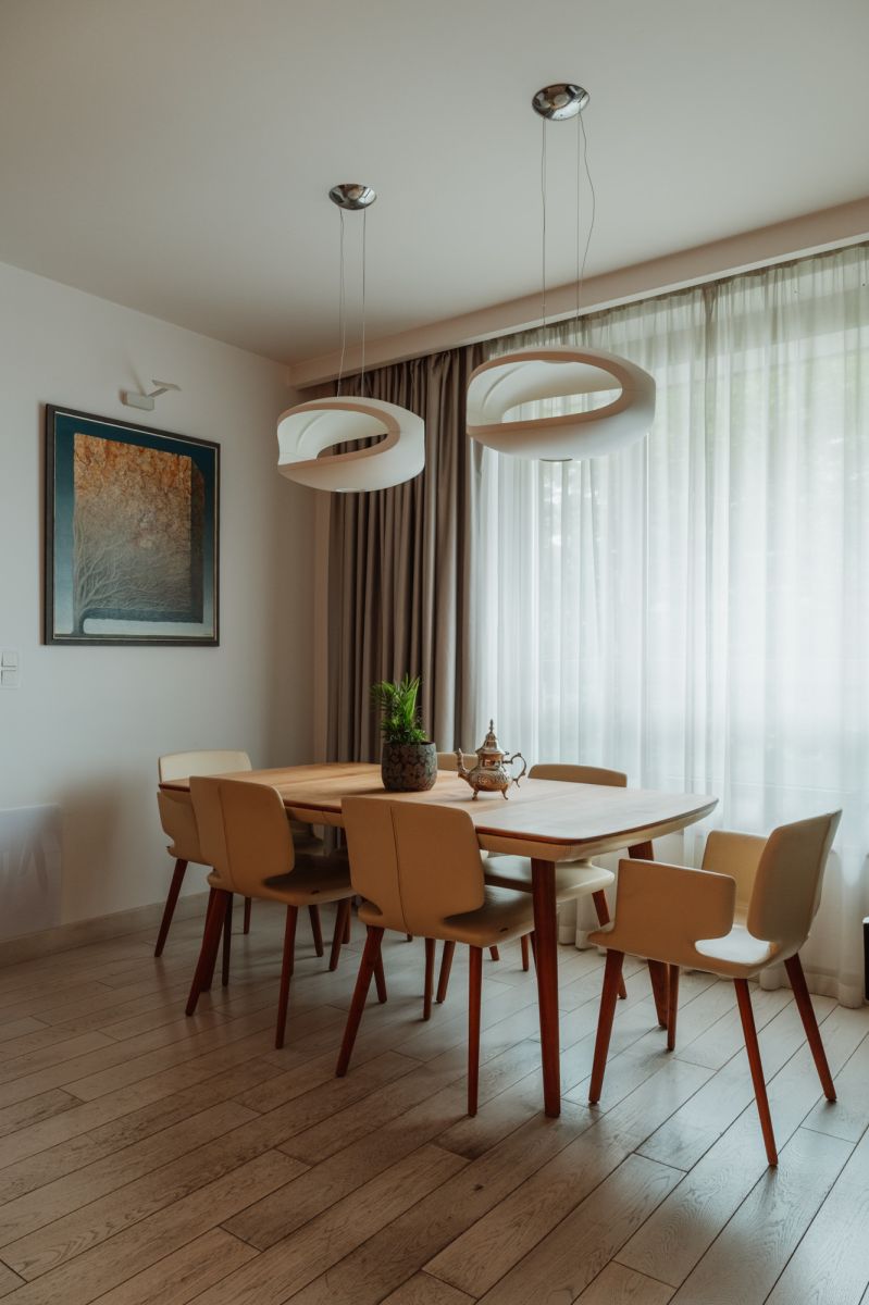 Przestronny salon z panoramicznymi oknami i wyjściem na loggię, otwarta kuchnia z jadalnią, pokój kinowy z dodatkową loggią, sypialnia master z prywatną łazienką (wolnostojąca wanna, bidet), dodatkowa sypialnia, gabinet, druga łazienka z prysznicem oraz osobna pralnia. W holu oraz w sypialniach - liczne zabudowy stolarskie.