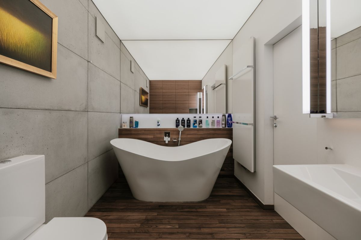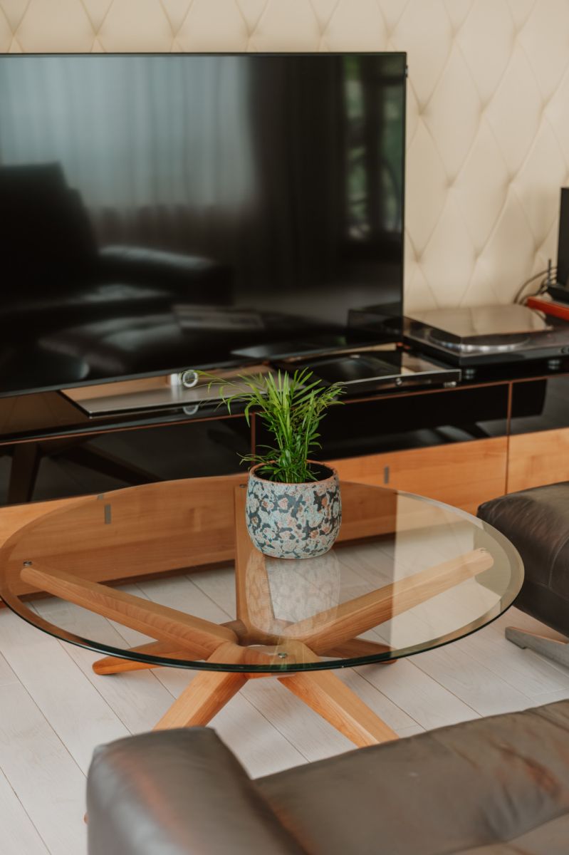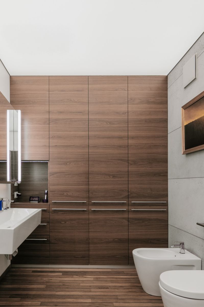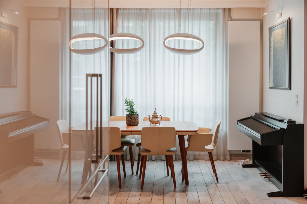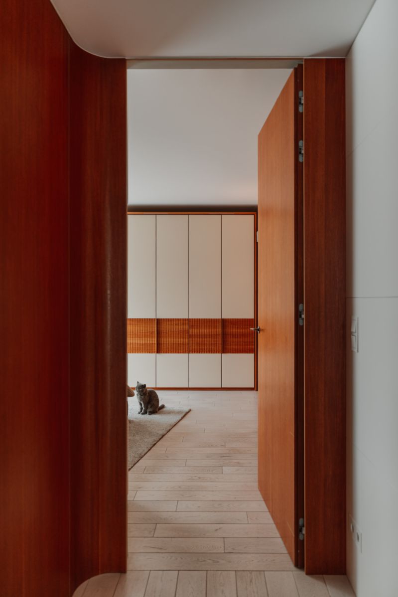 Przestronny salon z panoramicznymi oknami i wyjściem na loggię, otwarta kuchnia z jadalnią, pokój kinowy z dodatkową loggią, sypialnia master z prywatną łazienką (wolnostojąca wanna, bidet), dodatkowa sypialnia, gabinet, druga łazienka z prysznicem oraz osobna pralnia. W holu oraz w sypialniach - liczne zabudowy stolarskie.