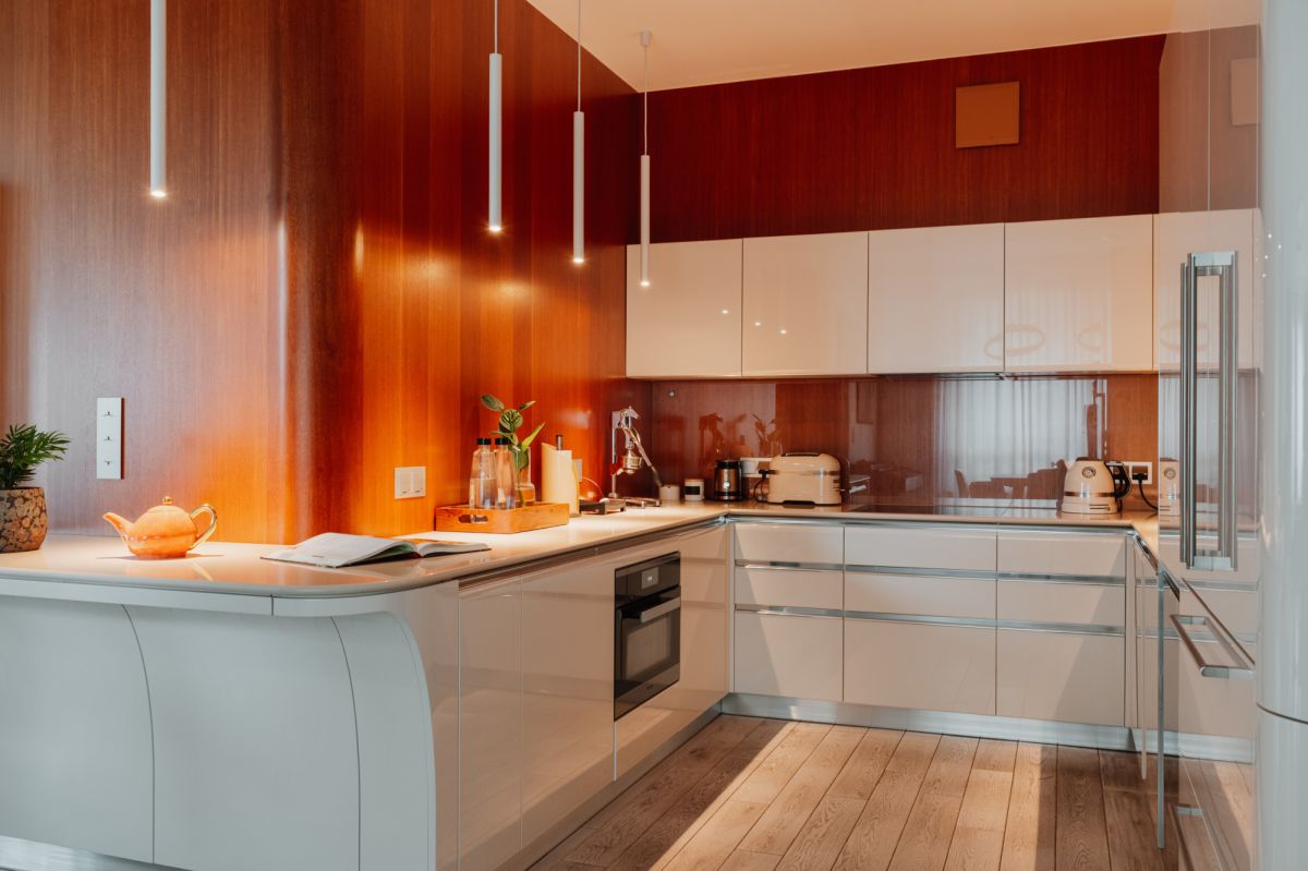 • Kuchnia z zaokrąglonymi frontami, stylizowana na lata 50.