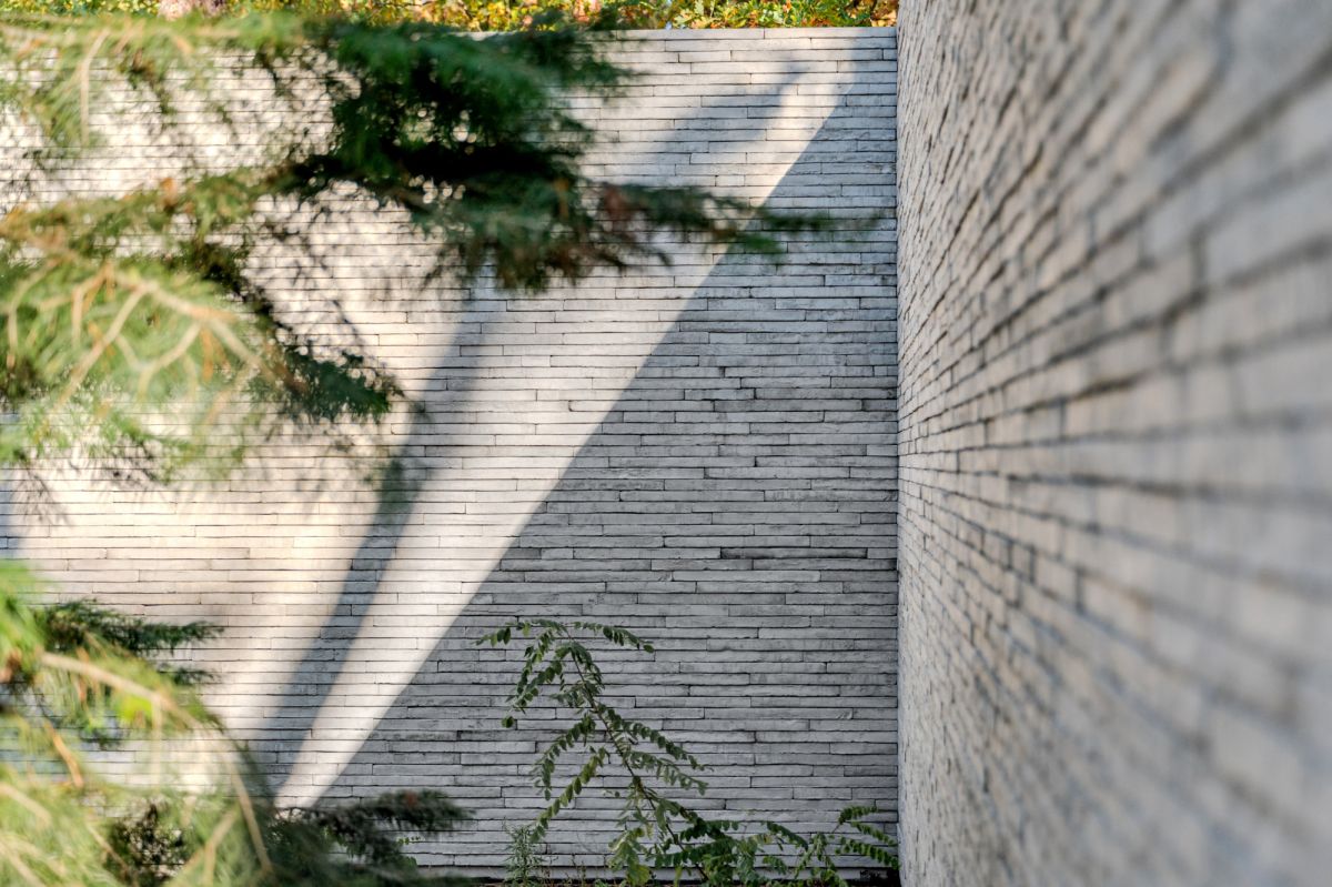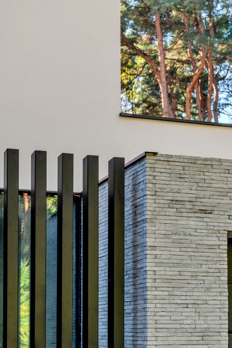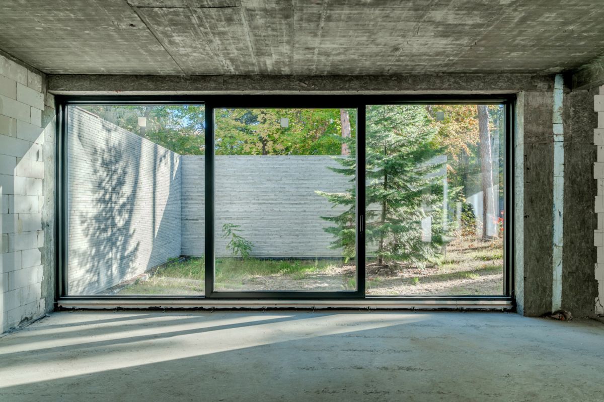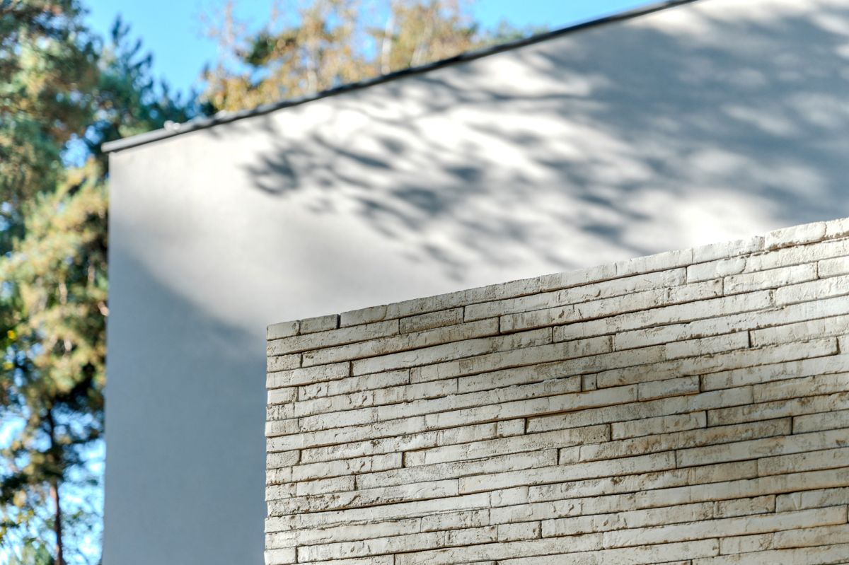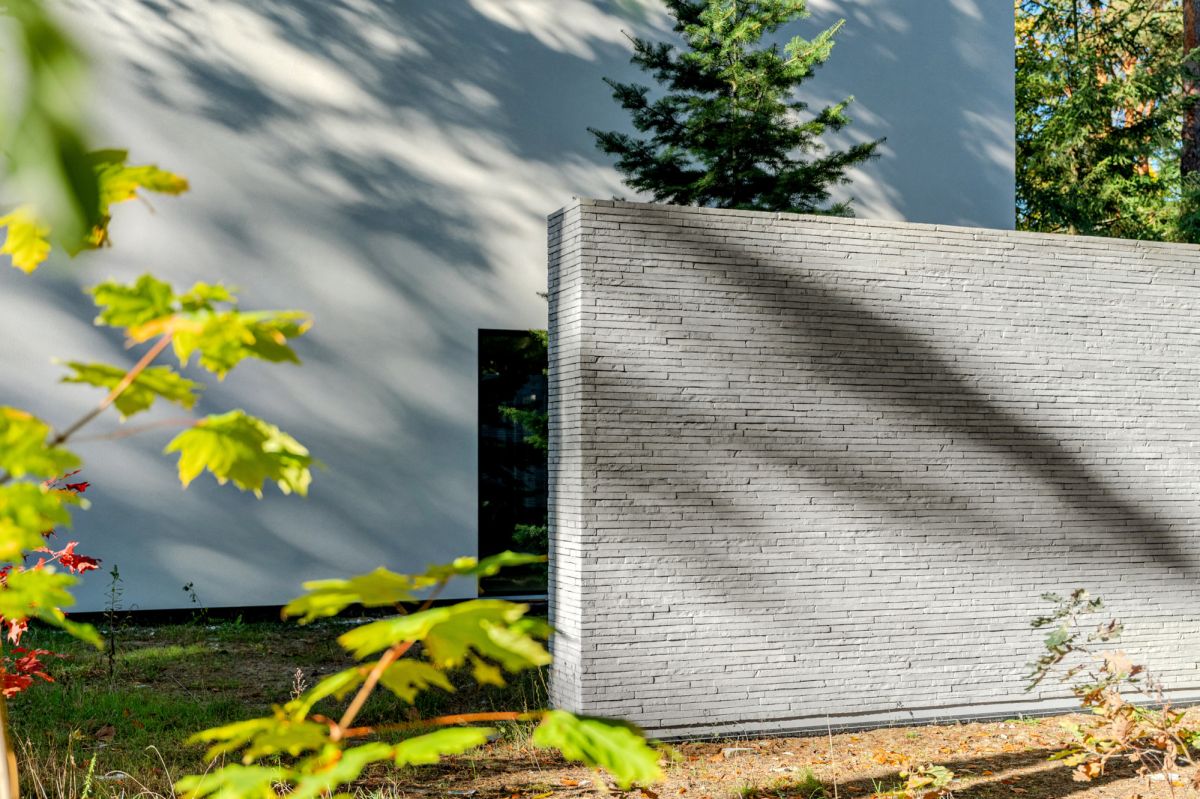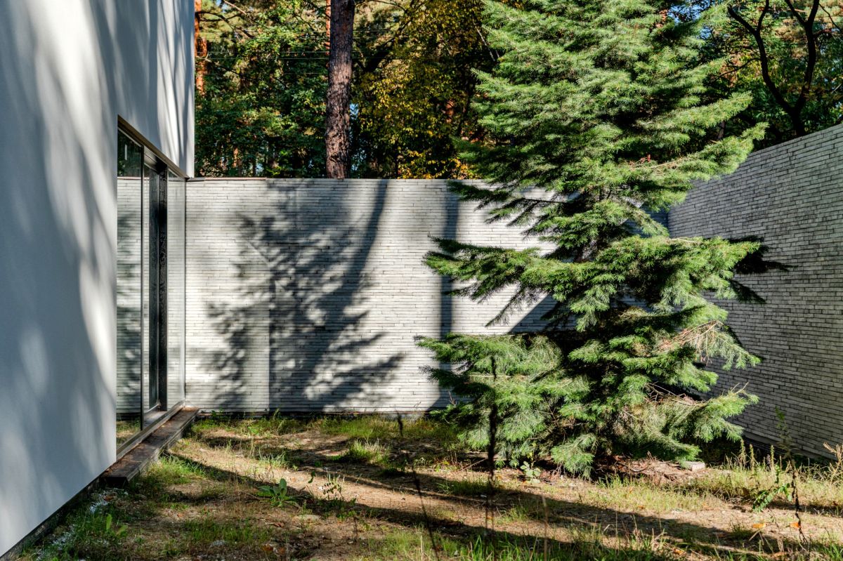 Основою концепції є взаємодія світла, тіні та фактури матеріалів. Бетон, скло та природні оздоблення утворюють цілісну мінімалістичну композицію, у якій світло створює ритм і глибину, а тіні, що змінюються протягом дня, підкреслюють структуру об’єму та деталі — наприклад, майстерно викладену бетонну цеглу.