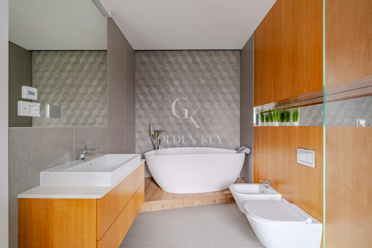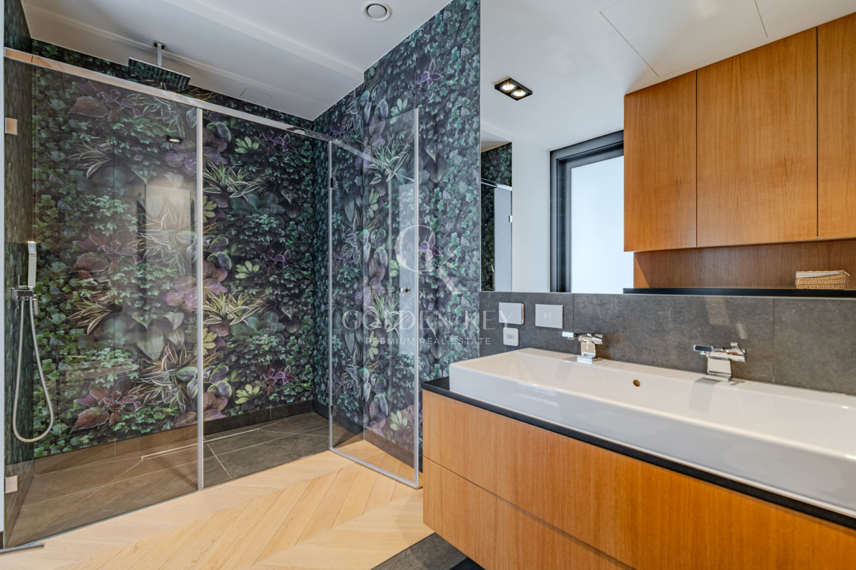 Висота стель: 3 м (окрім холу з підвісною стелею). У кухні та ванних кімнатах — підігрів підлоги. Інтер’єр виконаний з використанням високоякісних матеріалів: паркет у ялинку, великоформатна плитка, меблі на замовлення, кондиціонування повітря, система очищення повітря, техніка Gaggenau та Liebherr.