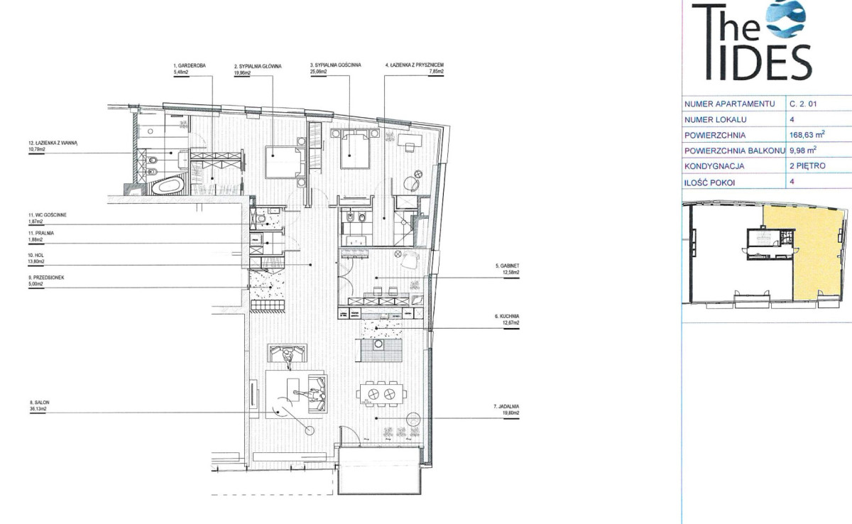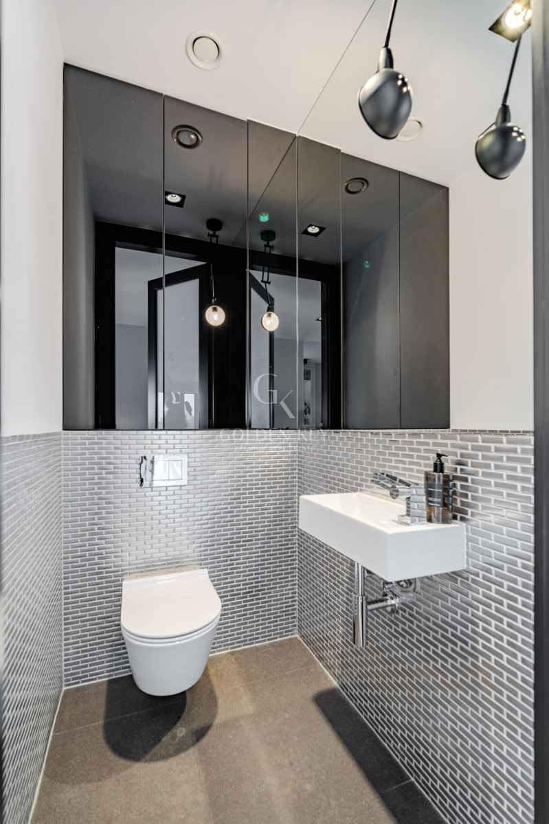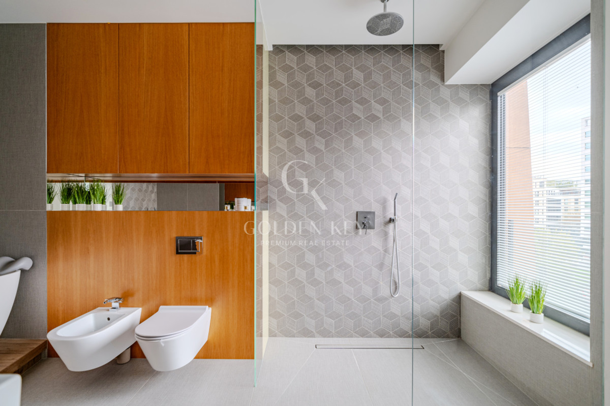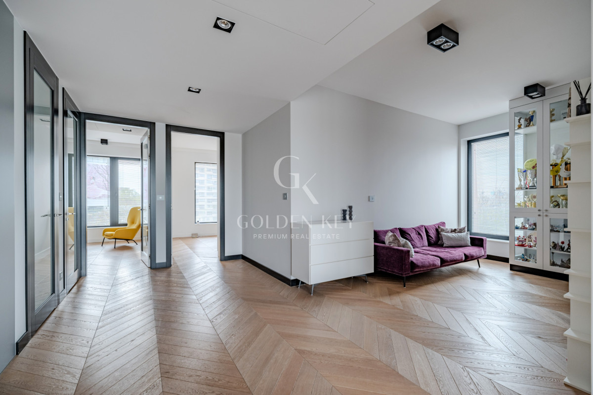 Повна власність із записом у земельному кадастрі. До апартаменту належать два місця на підземному паркінгу (обов’язкова покупка: 200 000 PLN).